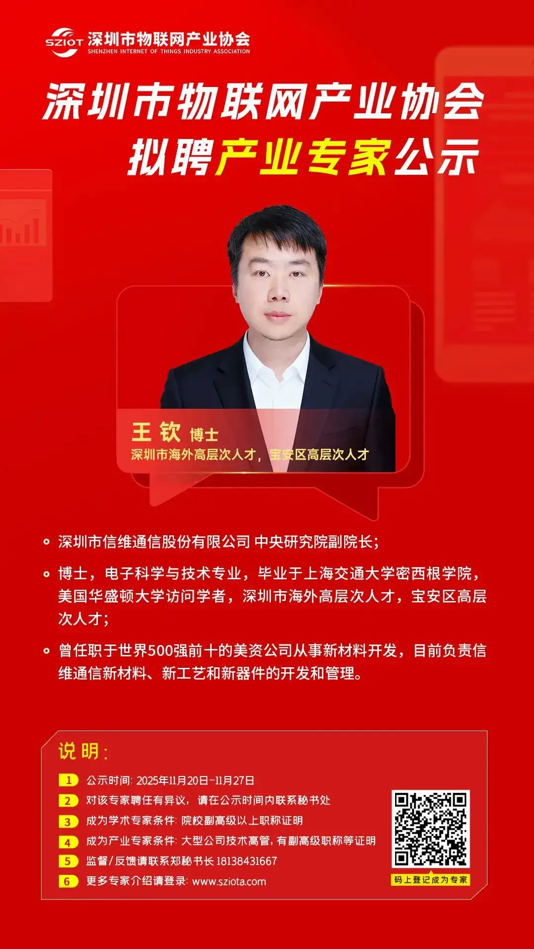 8、【專家公示】關于聘請王欽先生為深圳市物聯網產業協會產業專家的公示