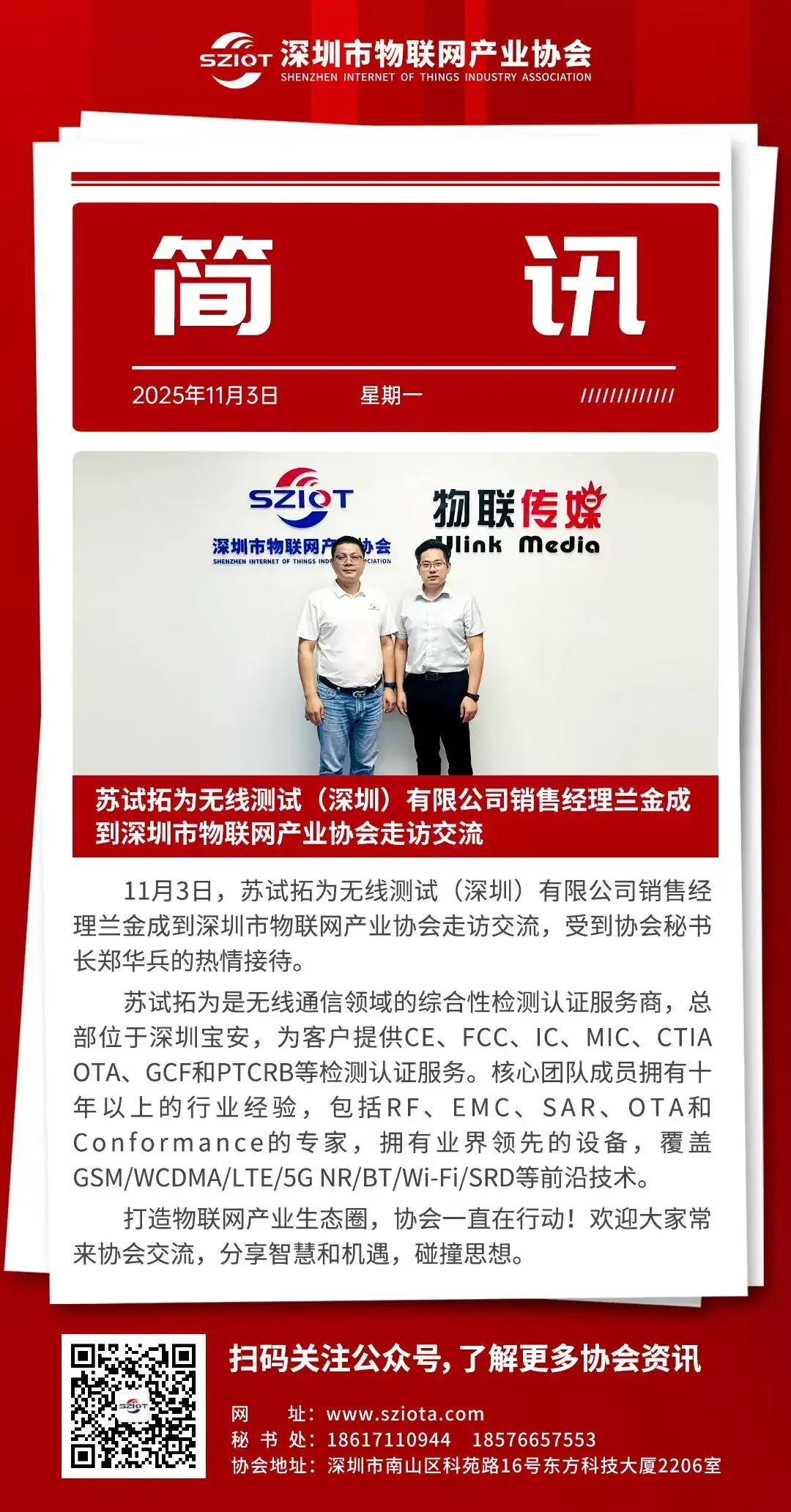 11月3日,蘇試拓為無線測試(深圳)有限公司銷售經理蘭金成到深圳市物聯網產業協會走訪交流,受到協會秘書長鄭華兵的熱情接待。