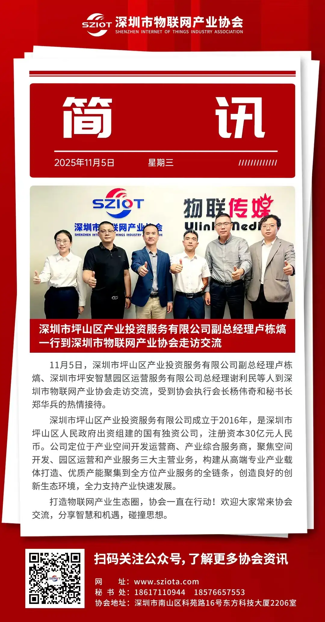 11月5日,深圳市坪山區產業投資服務有限公司副總經理盧棟熺、深圳市坪安智慧園區運營服務有限公司總經理謝利民等人到深圳市物聯網產業協會走訪交流,受到協會執行會長楊偉奇和秘書長鄭華兵的熱情接待。