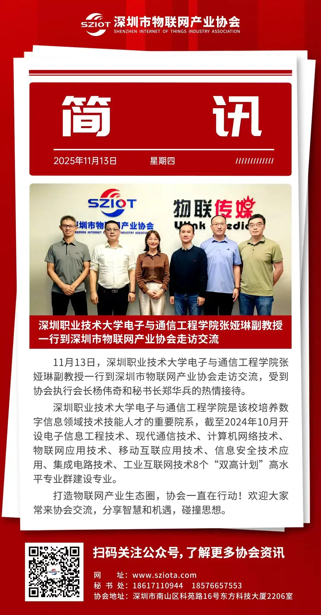 11月13日,深圳職業技術大學電子與通信工程學院張婭琳副教授一行到深圳市物聯網產業協會走訪交流,受到協會執行會長楊偉奇和秘書長鄭華兵的熱情接待。
