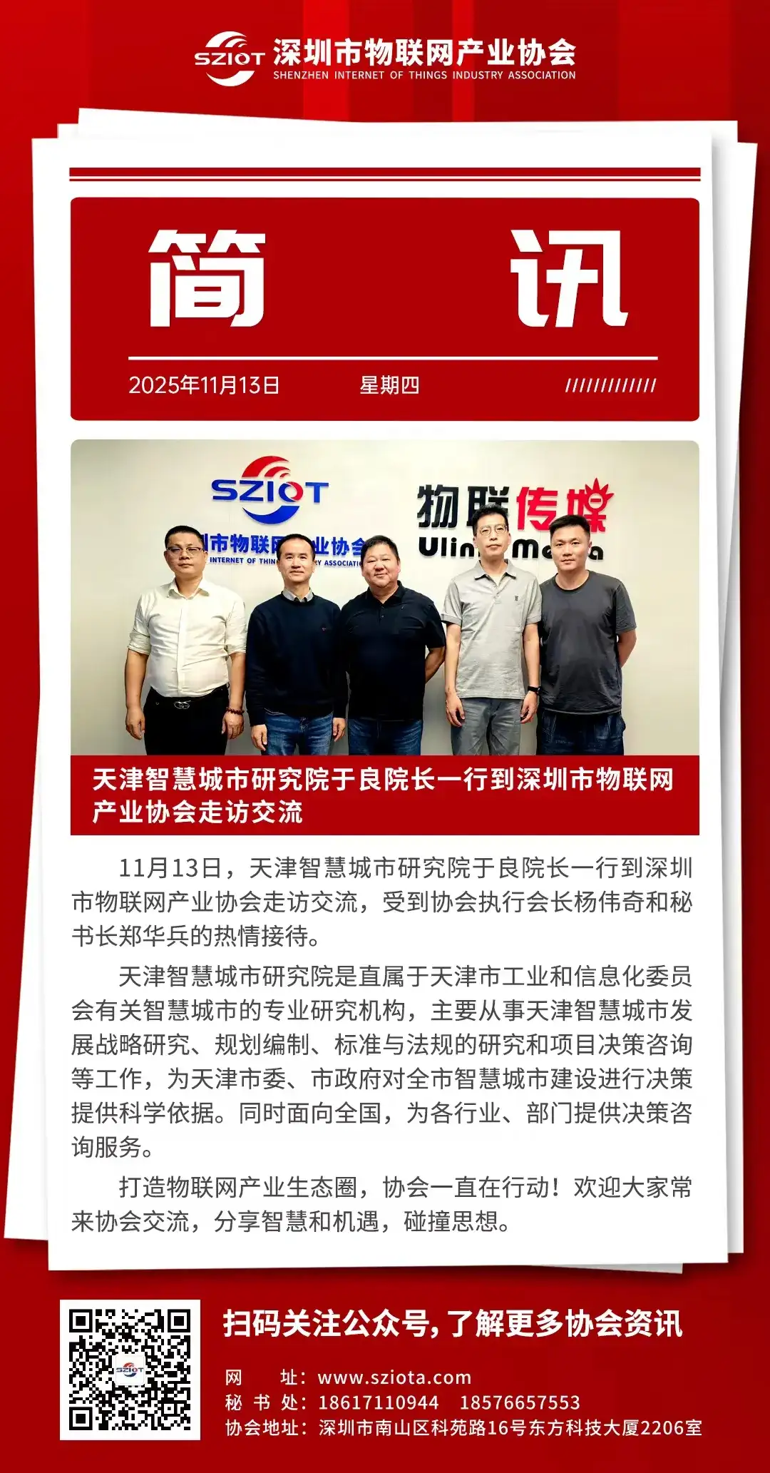11月13日,天津智慧城市研究院于良院長一行到深圳市物聯網產業協會走訪交流,受到協會執行會長楊偉奇和秘書長鄭華兵的熱情接待。