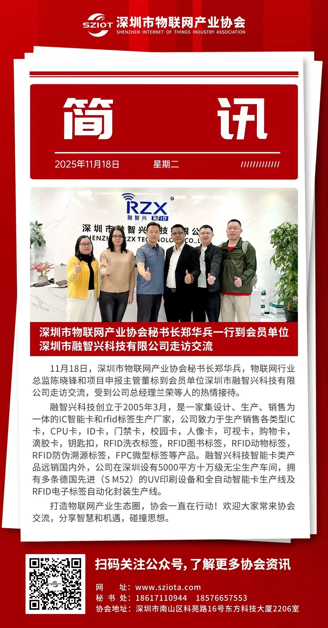 11月18日,深圳市物聯網產業協會秘書長鄭華兵,物聯網行業總監陳曉鋒和項目申報主管董標到會員單位深圳市融智興科技有限公司走訪交流,受到公司總經理蘭榮等人的熱情接待。